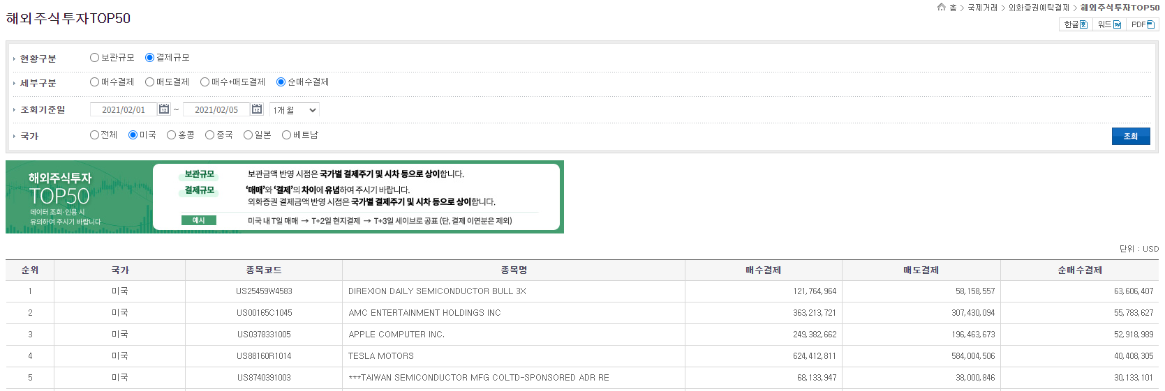 최근 게임스탑(GME) 때문에도 핫했고, 테슬라, 애플, TSMC, 이 외 바이든 정부 테마주 등으로 투자를 엄~청 하고 있더라구요. 각 증권사마다 해외조회순위 등을 제공하고 있지만 결제 규모 기준으로 각 증권사 통계를 통합한 것은 예탁결제원에서 정보를 주고 있어 내용 정리해보았습니다.