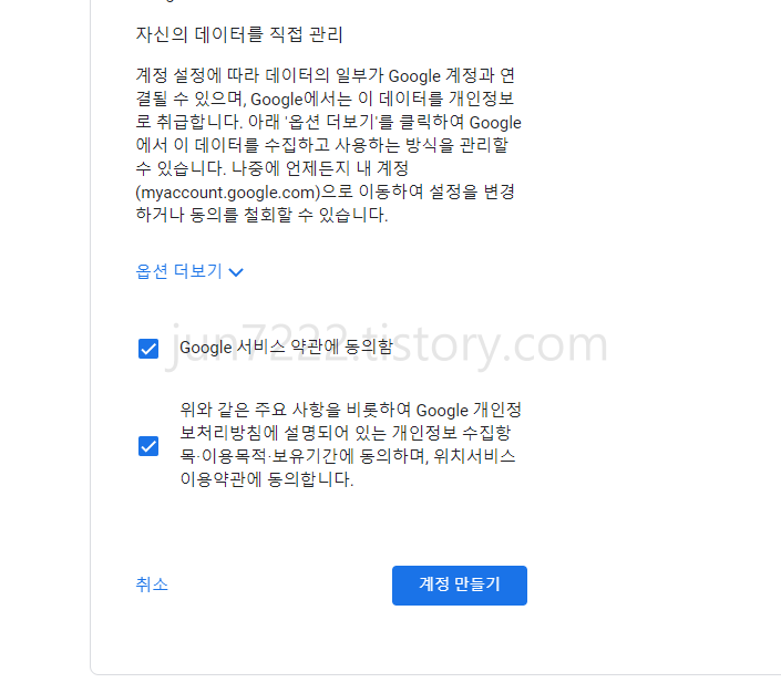 구글 서비스 약관 동의를 하고 계정 만들기를 선택하면 끝입니다.