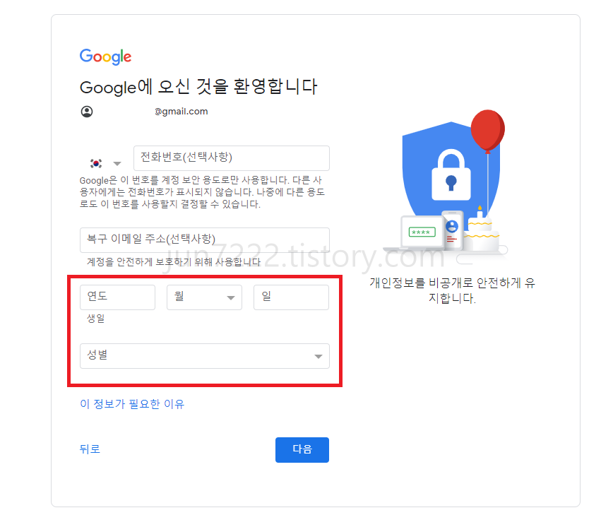 전화번호 입력란은 선택사항이기에 입력하지 않고, 생년월일, 성별만 입력하여 다음으로 진행하면 됩니다.